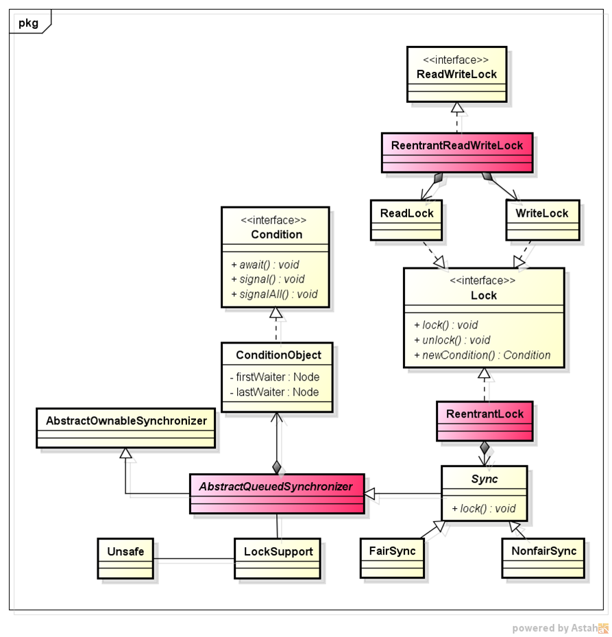 AQS(AbstractQueuedSynchronizer)是java lock的实现基础,如下类图描述,juc的很多实现都依赖AQS。AQS确实比较复杂, 所有不同锁的每个细节难以描述清楚,所以本文的重点是使用ReentrantLock作为例子只分析NonfairSync和condition的实现原理, 其它锁的实现原理都是以此作为基础进行扩展和优化。