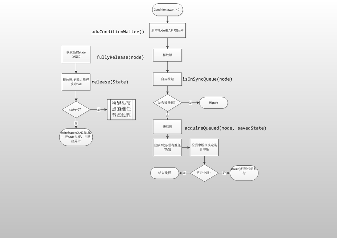- 1.将当前线程加入Condition锁队列。特别说明的是,这里不同于AQS的队列,这里进入的是Condition的FIFO队列。