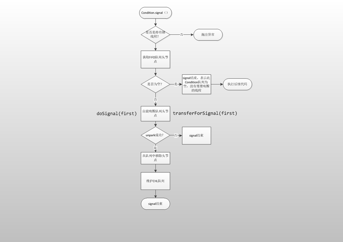signal就是唤醒Condition队列中的第一个非CANCELLED节点线程, 而signalAll就是唤醒所有非CANCELLED节点线程。当然了遇到CANCELLED线程就需要将其从FIFO队列中剔除。