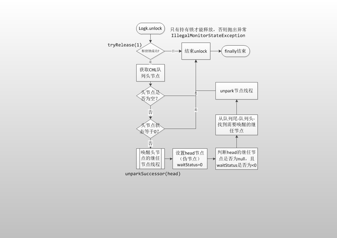 - 3.找到需要唤醒的继任节点,并进行线程唤醒操作(unpark()),同时会维护CHL队列,去除已中断或者超时的节点,结束锁释放过程。