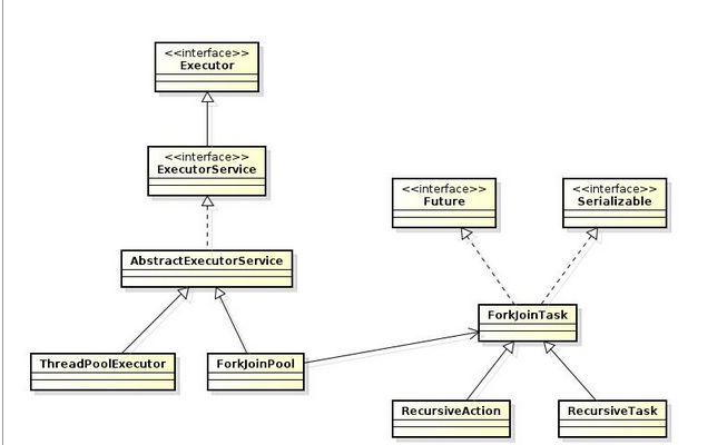Fork/Join框架被引入解决并行问题,而Executor解决的是并发问题。 ForkJoinPool和ThreadPoolExecutor共同继承与AbstractExecutorService;ForkjoinPool使用到了RecursiveAction和RecursiveTask。他们两个中RecursiveAction应用于执行的任务不需要返回结果的场景,而RecursiveTask应用于需要返回执行结果的场景。这点类似于ThreadPoolExecutor使用Runnable和Callable的参数来分别表示不需要返回值和需要返回值的线程执行对象。 ForkJoinPool由ForkJoinTask数组 和ForkJoinWorkerThread数组组成,ForkJoinTask数组负责存放程序提交给ForkJoinPool的任务,而ForkJoinWorkerThread数组负责执行这些任务。 其中ForkJoinPool有三个用来提交或开始任务的方法: submit:异步的执行Task,并且在任务结束后,可以使用getRawResult()方法获取返回值;在获取返回值之前,可能需要使用如 isQuiescent () 方法判断当前任务的执行结果。 execute:同submit类似,但是不带返回值 invoke:同submit类似,但是是同步的。 其余重要方法: shutdown():执行此方法之后,ForkJoinPool 不再接受新的任务,但是已经提交的任务可以继续执行。如果希望立刻停止所有的任务,可以尝试 shutdownNow() 方法 awaitTermination():阻塞当前线程直到 ForkJoinPool 中所有的任务都执行结束